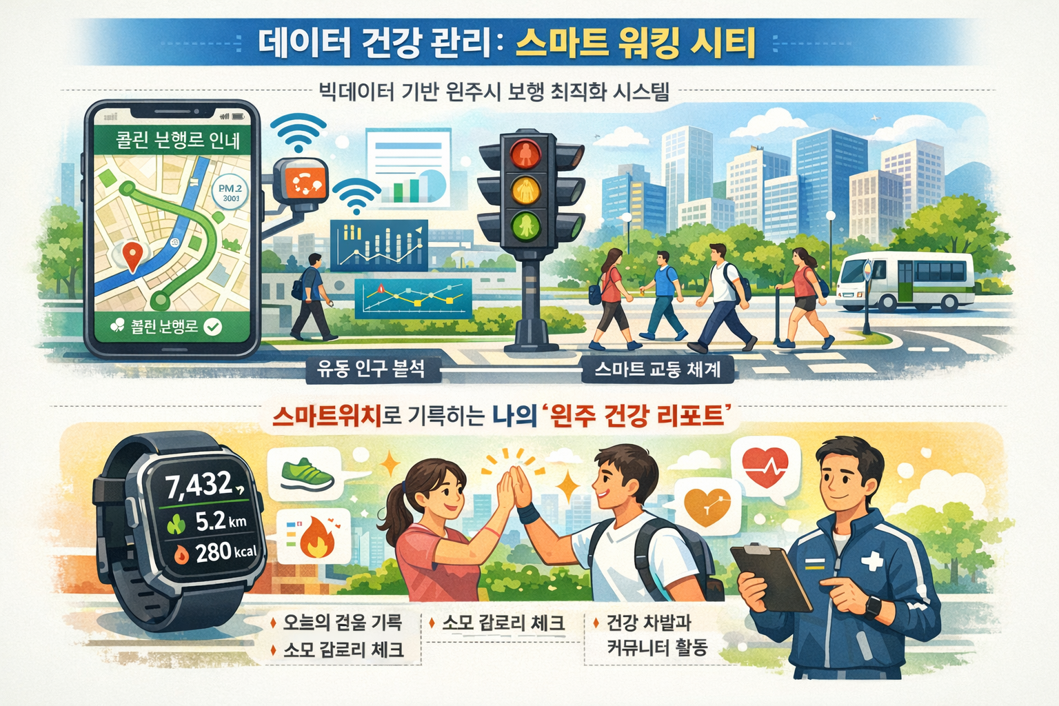 대한민국 대표 건강도시 원주의 명성에 걸맞게 치악산 둘레길과 원주 굽이길을 도심 녹지와 유기적으로 연결합니다. 자동차 중심의 도로를 사람 중심의 웰니스 공간으로 재편하여, 시민들이 일상에서 1만 보를 즐겁게 걷고 '걷기 왕국 원주'의 자부심을 느낄 수 있는 보행 친화 도시 전략을 제안합니다. (150자)
