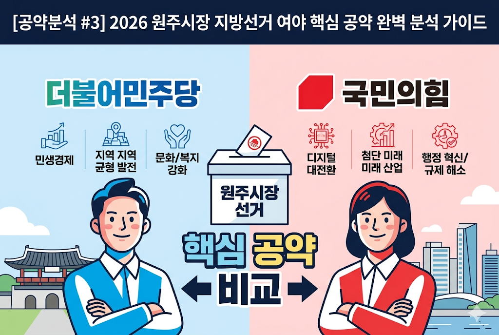 2026 원주시장 선거는 '미래 먹거리 산업 선점'과 '시민 체감형 생활 복지'의 대결로 요약됩니다. 여당 측은 AI 대전환과 군사 부지 개발을 통한 경제 재편을, 야당 측은 검증된 경력을 바탕으로 한 문화·관광 도시 완성과 보편적 복지 확대를 핵심 가치로 내세우고 있습니다.