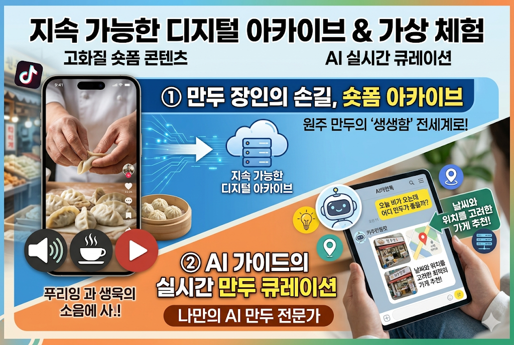 만두 골목을 중심으로 강원감영, 미로예술시장, 원주천 산책로를 잇는 반일/당일 투어 코스를 제안합니다. 단순히 만두만 먹고 떠나는 것이 아니라 주변 자원을 함께 소비하게 만드는 설계입니다. 블로그와 SNS에 이러한 코스 정보가 공유될 때, 검색 엔진은 원주를 체계적인 관광 시스템을 갖춘 지역으로 인식하여 '원주 가볼 만한 곳' 키워드 순위를 상위로 끌어올립니다.📱 6. 지속 가능한 디지털 아카이브와 가상 체험 💻
