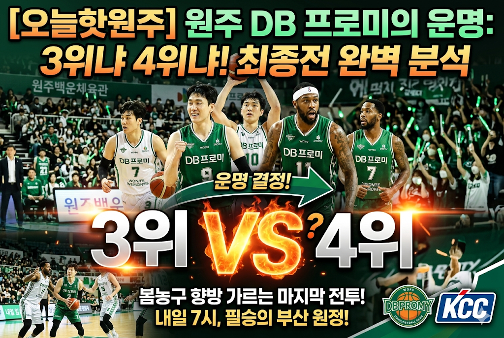 원주 DB 프로미의 이번 시즌은 마치 한 편의 드라마와 같습니다. 하위권에서 시작해 중위권을 거쳐 이제는 당당히 '공동 3위'라는 위치에서 더 높은 곳을 바라보고 있습니다. 3위냐 4위냐의 숫자를 넘어, 우리 선수들이 보여준 투지와 열정은 이미 원주 시민들에게 큰 감동을 주었습니다. 하지만 승부의 세계는 냉정하죠! 4월 8일 부산에서의 마지막 전투가 DB의 진정한 가치를 증명할 시간이 될 것입니다. 저 원주 정보맨도 끝까지 목청 높여 응원하겠습니다. 여러분도 함께 외쳐주세요! "Go DB! 원주의 자부심을 보여줘!" 플레이오프 대진표가 확정되는 대로 가장 빠르게 다시 소식 전해드리겠습니다. 원주 시민 여러분, 즐거운 농구 주간 되세요!※ 본 콘텐츠는 개인의 의견을 바탕으로 작성된 것이며, 원주의 발전을 위해 다양한 의견을 나누는 장이 되기를 바랍니다. 논쟁을 목적으로 하지 않으며, 건설적인 대화와 공유를 지향합니다