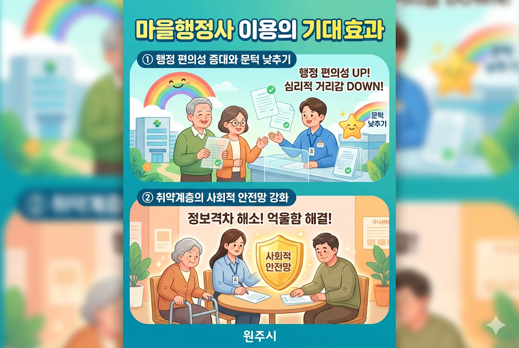 정보 격차로 인해 소외되었던 노인층이나 저소득층에게 마을행정사는 든든한 가이드가 됩니다. 서류 작성이 어려워 혜택을 못 받거나 억울한 처분을 당해도 참고 넘기던 분들에게 실질적인 도움을 제공합니다. 이는 원주시가 지향하는 따뜻한 동행과 사회적 안전망 확충을 실현하는 핵심적인 복지 인프라입니다.
