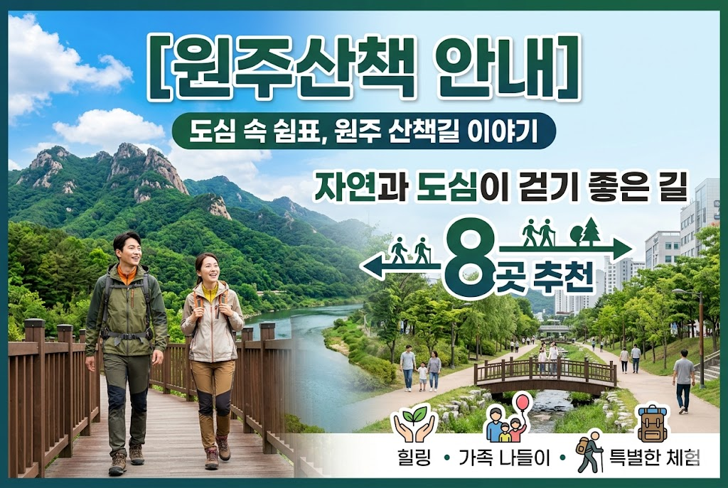 [핵심 요약] 원주는 치악산과 섬강을 품은 도시로 자연과 도심이 어우러진 산책 명소가 많습니다. 이번 시리즈에서는 원주에서 걷기 좋은 길 8곳을 소개하며, 각 산책로를 두 가지 카테고리로 나누어 특징을 정리했습니다. 힐링, 가족 나들이, 특별한 체험까지 다양한 목적에 맞는 길을 찾을 수 있습니다.