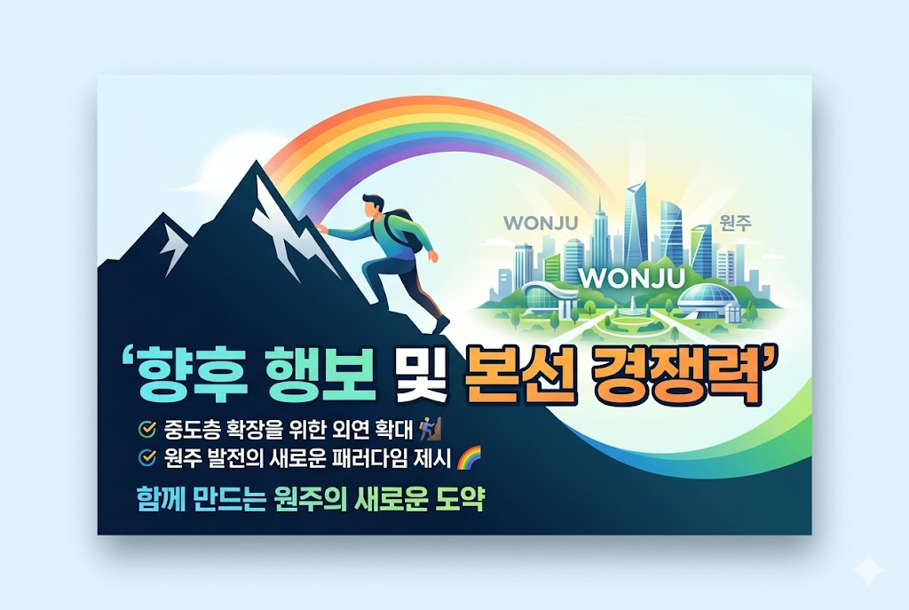 그의 본선 경쟁력은 '진정성'과 '준비성'에서 나옵니다. 4년 전의 패배를 자양분 삼아 더욱 촘촘해진 공약과 원주에 대한 깊은 이해도는 상대 후보가 쉽게 넘기 힘든 벽입니다. 원주를 강원권의 중심을 넘어 수도권과 경쟁하는 자립 도시로 만들겠다는 원대한 포부는 유권자들에게 새로운 희망의 메시지로 다가가고 있으며, 이는 본선 승리를 위한 강력한 동력이 될 것입니다.