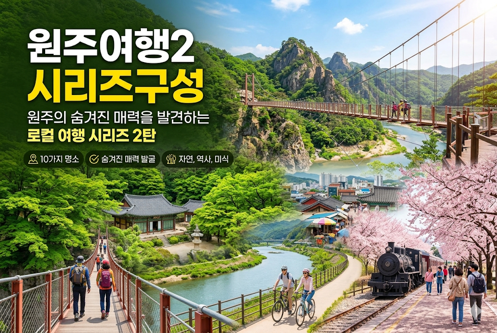 원주의 숨겨진 매력을 발견하는 로컬 여행 시리즈 2탄. 액티비티, 역사, 미식, 힐링, 야경을 아우르는 10가지 명소 가이드입니다.