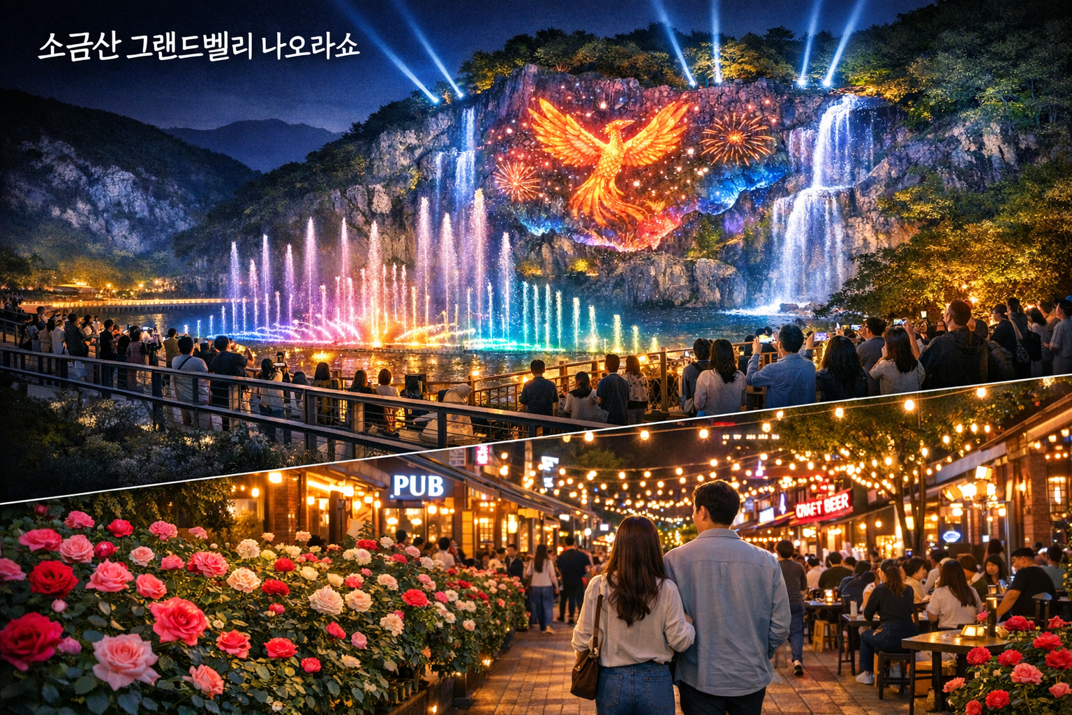 밤이 되면 소금산 암벽에 화려한 미디어 파사드가 펼쳐집니다. 음악 분수와 조명이 어우러진 환상적인 밤의 축제를 즐겨보세요.