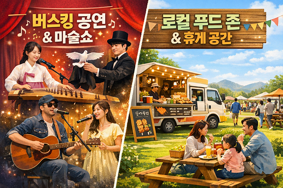 축제장 곳곳에서는 매일 색다른 버스킹 공연과 마술쇼가 펼쳐져 흥을 돋웁니다. 지역 예술인들이 참여하는 소규모 공연들은 축제에 활력을 불어넣으며, 관람객들이 잠시 쉬어가는 공간마다 즐거움을 선사합니다. 어울림광장에서는 시간대별로 퓨전 국악, 재즈, 인디 밴드 등 다양한 장르의 공연이 준비되어 있어 눈과 귀가 모두 즐거운 시간을 보낼 수 있습니다.