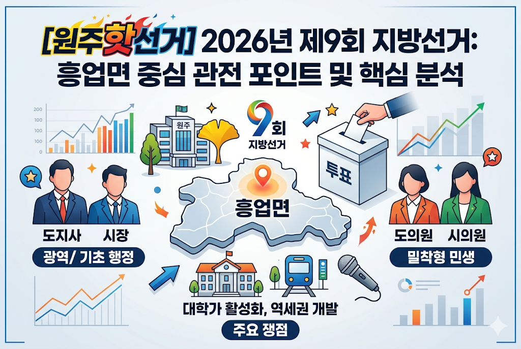 2026년 6월 3일, 우리 흥업면의 향후 4년을 결정지을 제9회 전국동시지방선거가 다가오고 있습니다. 강원특별자치도지사부터 원주시장, 그리고 우리 지역을 대변할 도·시의원까지! 이번 선거의 핵심 쟁점과 흥업면 중심의 관전 포인트를 꼼꼼하게 정리해 드립니다.