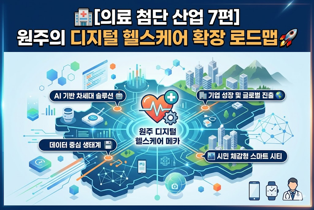 강원도 원주가 전통적인 제조 기반 의료기기 산업을 넘어, **AI와 빅데이터가 결합된 '디지털 헬스케어의 메카'**로 도약합니다. 시민 체감형 서비스부터 글로벌 시장 진출까지, 데이터로 생명을 살리는 원주의 미래 성장 동력과 확장 로드맵의 핵심 정수를 한눈에 확인해 보세요!