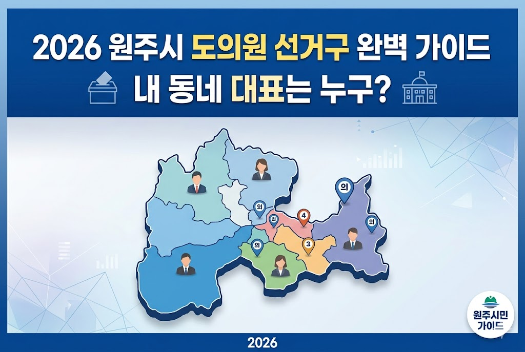 2026년 제9회 지방선거를 앞두고 원주시 강원도의원 선거구에 큰 변화가 예상됩니다. 특히 인구가 급증한 지정면(기업도시)의 단독 분구 여부와 기존 8개 선거구의 재편이 핵심 관전 포인트입니다. 내 거주지가 어느 선거구에 속하는지 미리 확인하여 소중한 투표권을 준비하세요!
