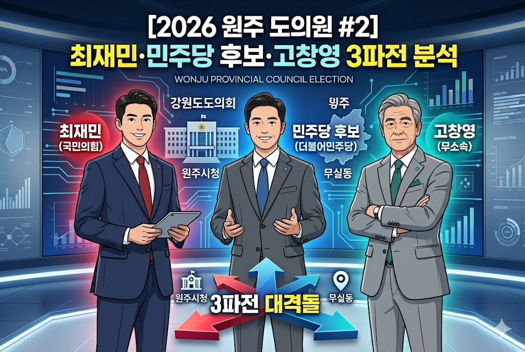 2026년 무실동 도의원 선거는 현역 최재민 의원의 탄탄한 수성과 더불어민주당 전직 의원들의 권토중래, 그리고 무소속 고창영 후보의 신선한 도전이 어우러진 최고의 승부처입니다. 여당, 야당, 무소속이라는 세 갈래 길 앞에서 무실동 주민들은 어느 때보다 신중한 선택을 앞두고 있습니다. 정당의 간판보다는 후보의 실명을, 감성적인 구호보다는 실질적인 데이터를 확인하는 유권자의 현명함이 필요합니다. 무실동을 원주의 중심에서 강원의 중심으로 만들 리더는 누구일까요? 이 글이 여러분의 소중한 한 표를 결정하는 명확한 가이드가 되길 바랍니다. 무실동의 미래를 위해 꼭 투표에 참여해 주세요!